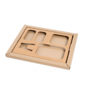 Cardboard base for the Thema meal tray, to be combined with a lid in different colours: apple green CTHVP, vanilla CTHVA, tangerine CTHM, kraft CTHK, fuchsia/black CTHF or white with window CTHF100. The tray can be completed with one of our Cubik crockery kits, with or without lid.
