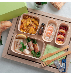Madera trays are made from poplar wood, with a PET film to make them watertight, and are suitable for baking in a conventional oven (200°C) and in the microwave.