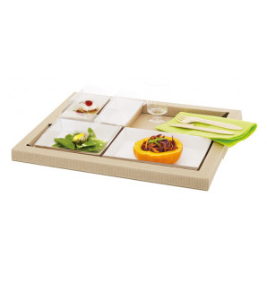For serving, a slate grey non-slip placemat can be placed on the bottom of the tray NAD3227. A kraft cardboard verrine holder (20 x 40 cells) holds 20 Kova 6cl verrines CAL20C.