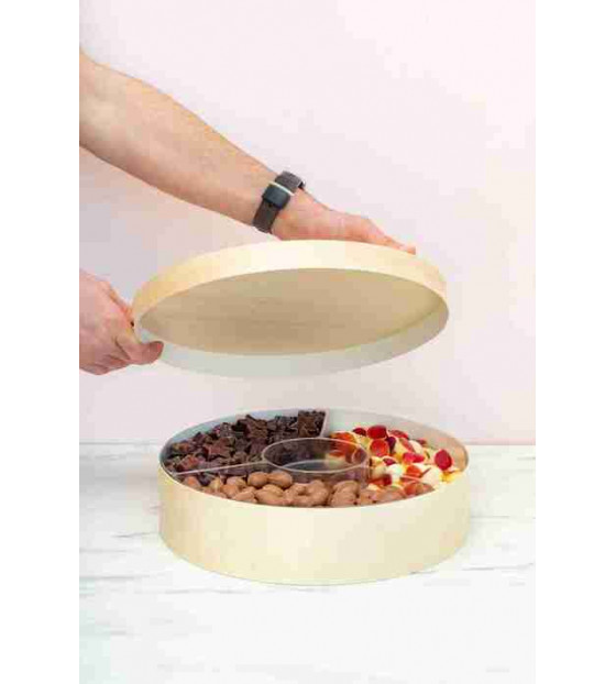 Made in France from French poplar wood sourced from sustainably managed forests, this round, XXL-format box (Ø 330 mm x H 80 mm) offers a 6-liter capacity—ideal for corporate breakfasts, gift sets, or festive group meals.