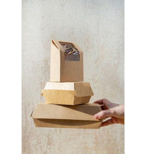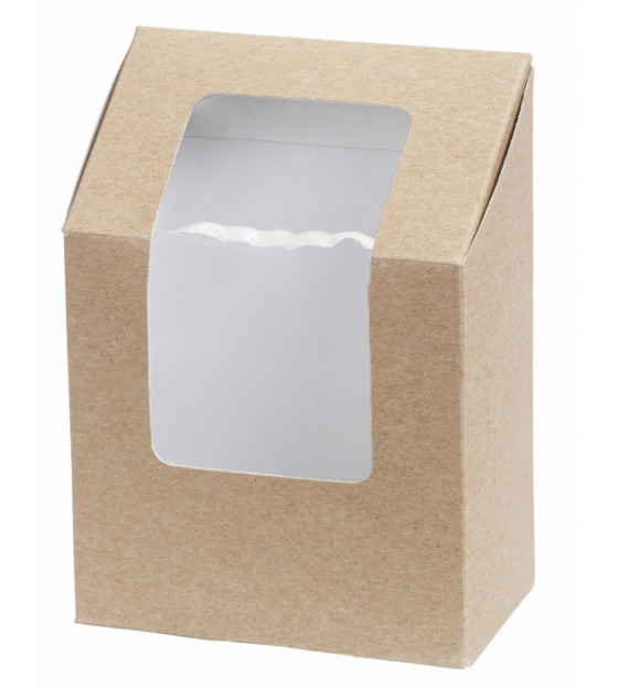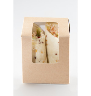 Kraft box with transparent window for easy viewing of contents. Ideal for wraps and tortillas. Delivered flat and easy to assemble, it optimises storage on the shelves and in the windows of cafeterias, sandwich shops or bakeries. For same-day consumption.
