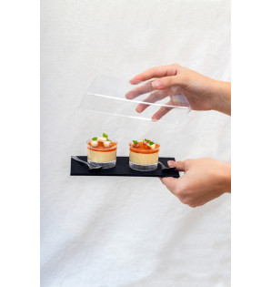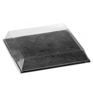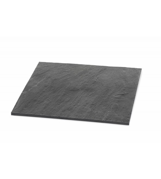Large black square plate with slate-effect texture. With no rim, this plate can also be used as a presentation tray. High-quality and sturdy, it is made of washable, reusable and recyclable PS.