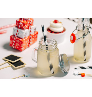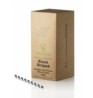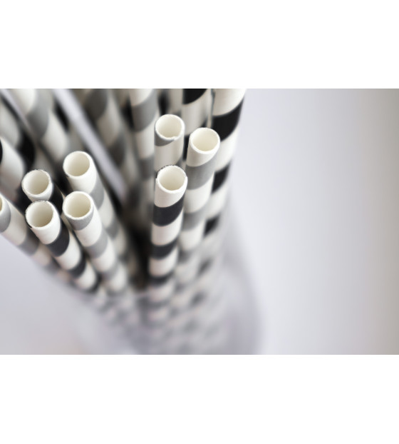 Straight straw with black and white stripes made from high-quality cardboard. Its special construction gives it thickness and durability: no change of state on contact with liquids (neutral or spirits) for more than 2 hours. Packaged in dispenser boxes of 250.