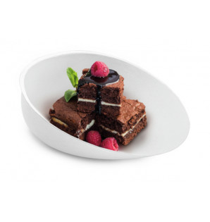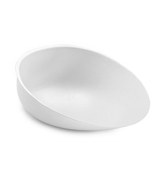 Large white bagasse plate with a sleek, asymmetrical design. Also available in cup format KAB87S.