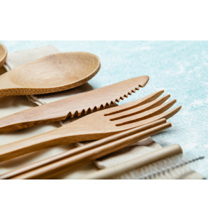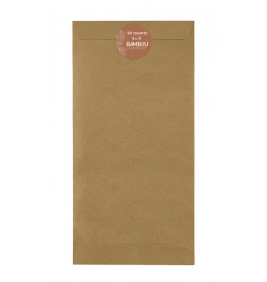 Durable bamboo cutlery, sold in a 4/1 kit (knife, fork, spoon, napkin). Embellished with a food-safe varnish, this high-quality cutlery is perfect for your selective takeaway formulas.