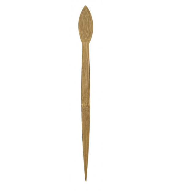 Long, slender bamboo cocktail spoon. Its pointed end can be used as a pick, to easily pick up fruit from the bottom of a glass, for example.