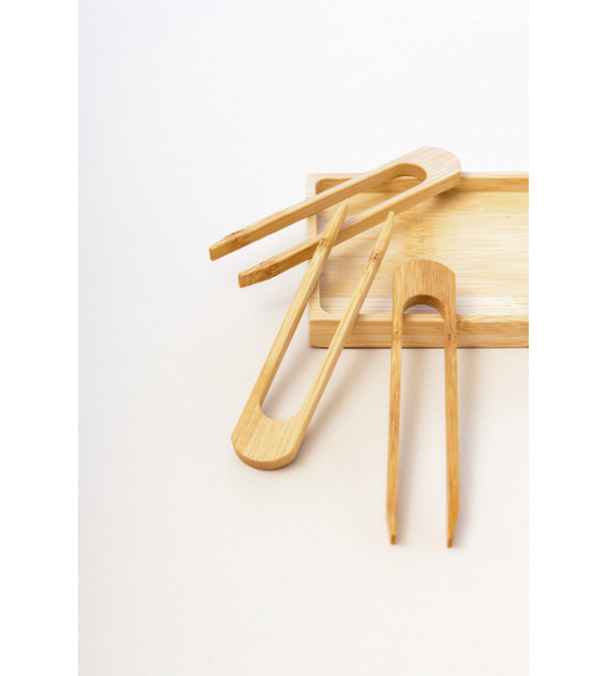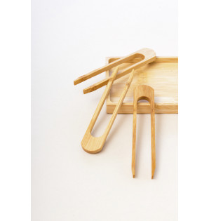 One-piece bamboo tongs with bevelled ends. Good quality, it grips food securely without deforming.