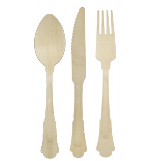 Natural cutlery made from birch wood, without coating or surface treatment. With their elegant baroque design, they will bring style to your meal trays, take-away offers or country events.