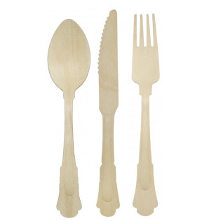 Natural cutlery made from birch wood, without coating or surface treatment. With their elegant baroque design, they will bring style to your meal trays, take-away offers or country events.