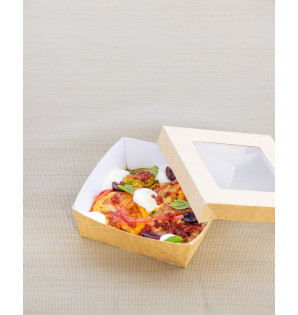 Cardboard tray coated with a food-safe varnish to ensure that it is watertight and greaseproof.