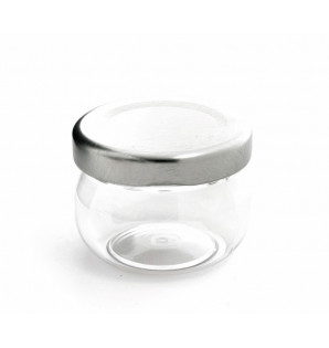 Mini PET container, reusable and recyclable, for use as a mini sauce boat or for tasting samples. A screw-on metal lid is sold separately CVM43. This model is also available in glass MPV3, for use with the same lid.