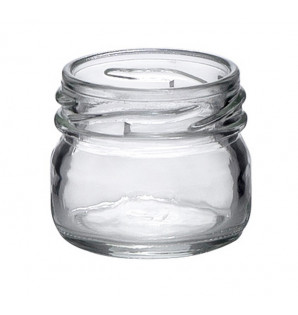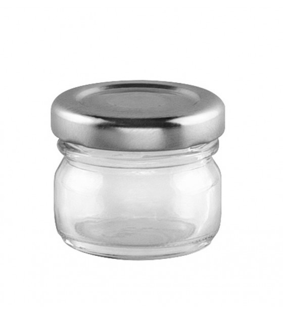Mini blass container, reusable and recyclable, for use as a mini sauce boat or for tasting samples. A screw-on metal lid is sold separately CVM43. This model is also available in PET MP420, for use with the same lid.