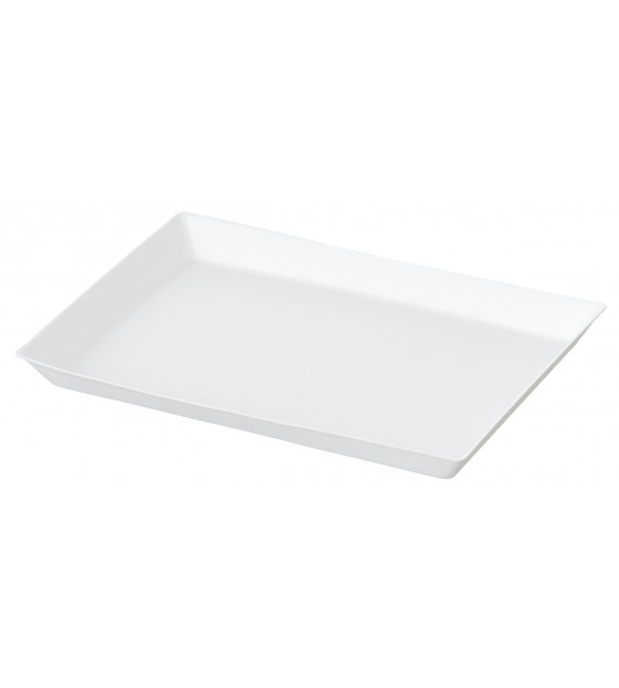 Oven- and microwave-safe Cubik Fibra small rectangular plate in white bagasse, in large packs.
