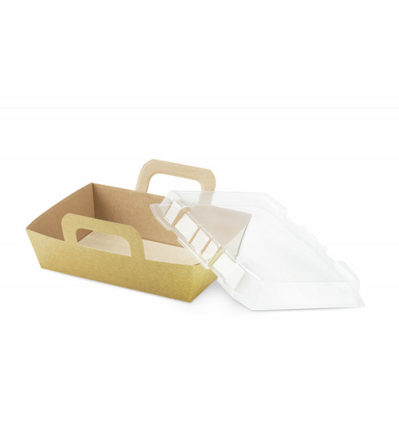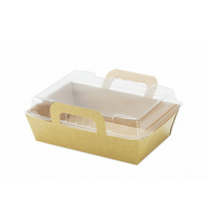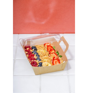 Kraft cardboard container with transparent rPET clip-on lid. Its handles keep the lid closed.
