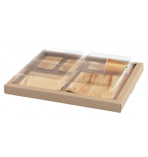 Prix €410.90 HTBK4AReady-to-use meal tray delivered assembled, consisting of : - Base + wedge in micro-fluted kraft cardboard, recyclable - Transparent partitioned lid, recyclable - 1 plate 180x180mm, 1 plate 170x120mm and 2 plates 120x70mm. Palm tree tableware is oven and microwave safe. The tray is also available with a black cardboard lid BK4AN -