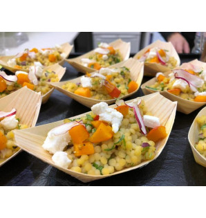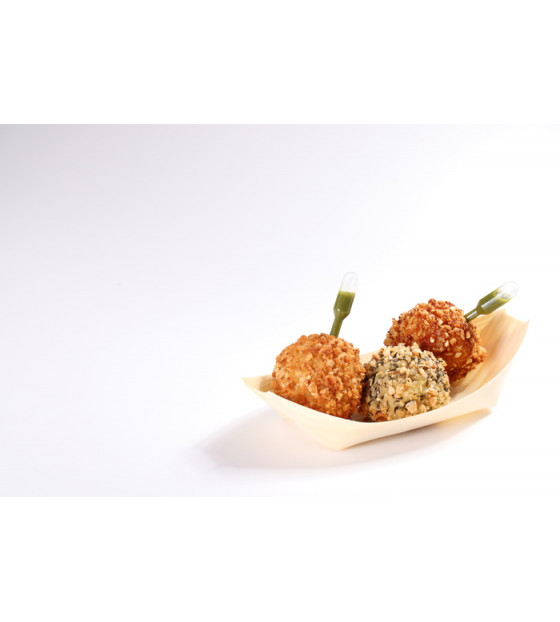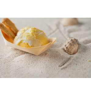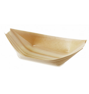 Natural container made of thin, folded wooden sheets, with non-watertight corners. Oven and microwave safe.