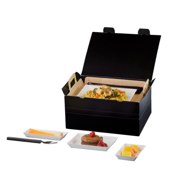 Consists of : -1 Essentiel box + 1 divider - 1 Cubik bagasse 180x130 plate + 1 Cubik bagasse 130x130 plate + 2 Cubik bagasse 130x65 dishes with lids
