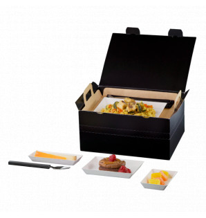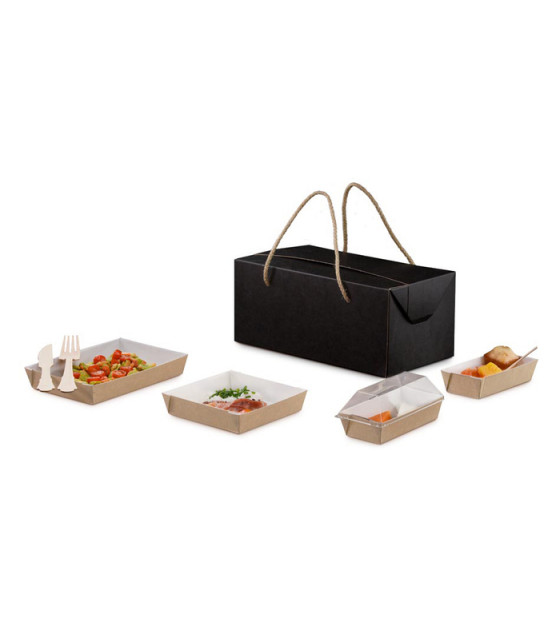 1 Faubourg box in black cardboard 280x150xh120 mm FBG28 1 Cubik tray in kraft/PET cardboard 180x130xh30 mm AKN18 1 Cubik tray in kraft/PET cardboard 130x130xh30 mm AKN13 1 Cubik tray in kraft/PET cardboard 130x65xh30 mm AKN6 RPET lids ACC6 ACC13 ACC18