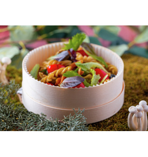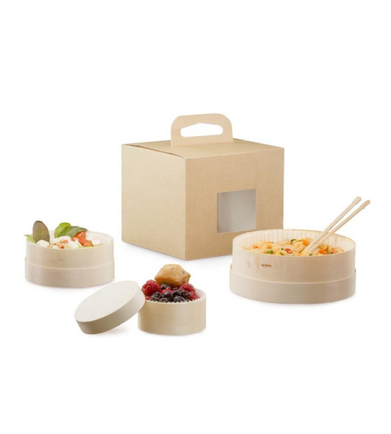 1 Bento box in kraft cardboard 175x175xh150 mm CBK17 1 round tin 15 cl with French poplar lids and paper/PET boxes Ø82 h40 mm WB86 1 round tin 45 cl with French poplar lids and paper/PET boxes Ø118 h50 mm WB120 1 round tin 1 liter with French poplar lids and paper/PET boxes Ø163 h60 mm WB160XL