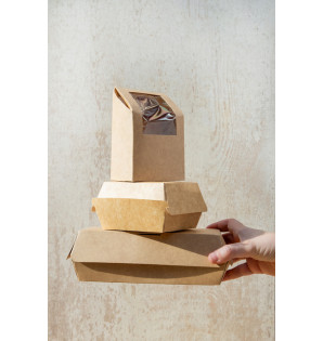 Large sandwich-size burger box, made from kraft cardboard with a kraft lining. Made in France and recyclable.
