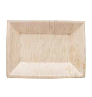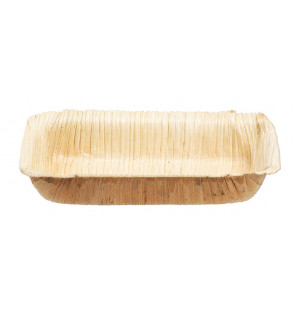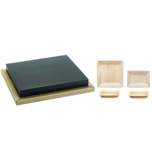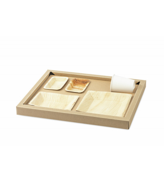 Ready-to-use meal tray delivered assembled, consisting of : - Base + wedge in recyclable, micro-fluted kraft cardboard - Black cardboard lid, recyclable - 1 plate 180x180mm, 1 plate 170x120mm and 2 plates 120x70mm. Palm tree tableware is oven and microwave safe. The tray is also available with a transparent lid BK4A