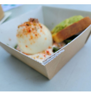 25 cl kraft cardboard bowl with a PET coating that makes it watertight (including at the corners). Oven (100°C) and microwave safe.