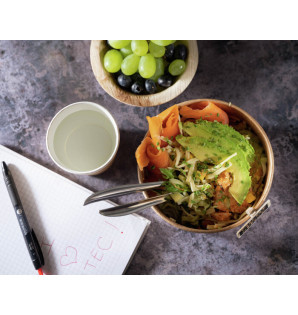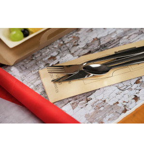 A set of stainless steel cutlery with a modern, refined design and great durability. Washable and reusable, they will be your ally for your service or your take-away meals. The kits come in a kraft pouch.