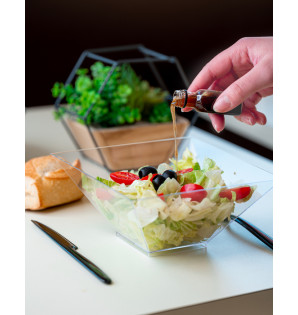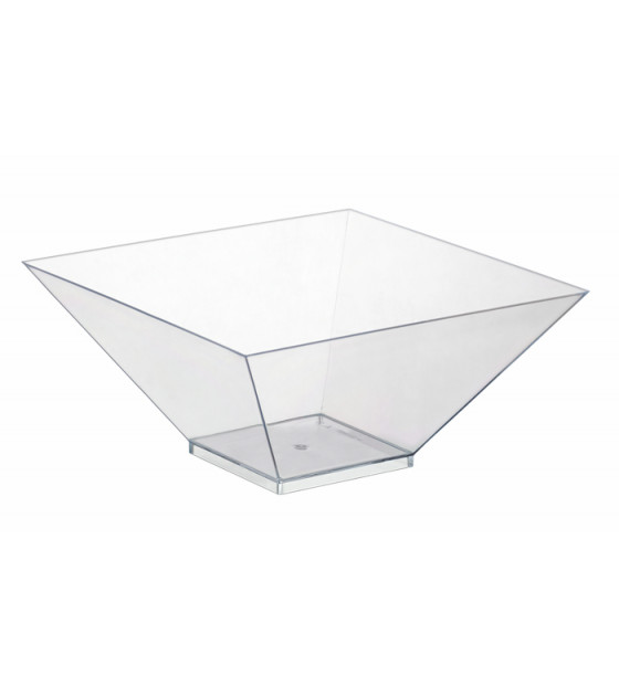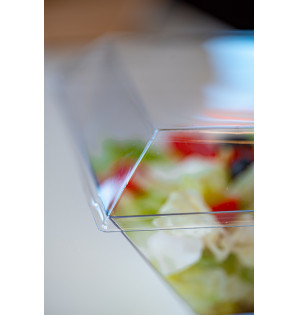 Square salad bowl with a wide opening. Made from transparent PS, it is recyclable.