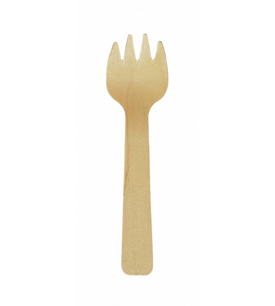 Mini wooden fork/spoon. This 2-in-1 cutlery set is ideal for savory and sweet verrines or French fries served in a cone. Also available in large packs (2500 u.) XMFC105
