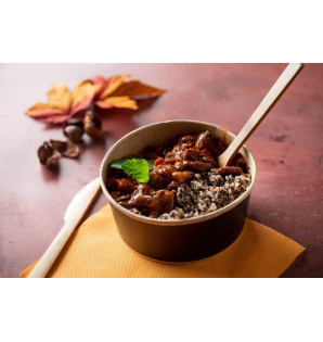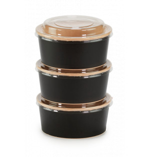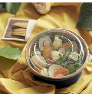 Black salad bowl with kraft interior, ideal for cold dishes. A PP lid is available CPOK155