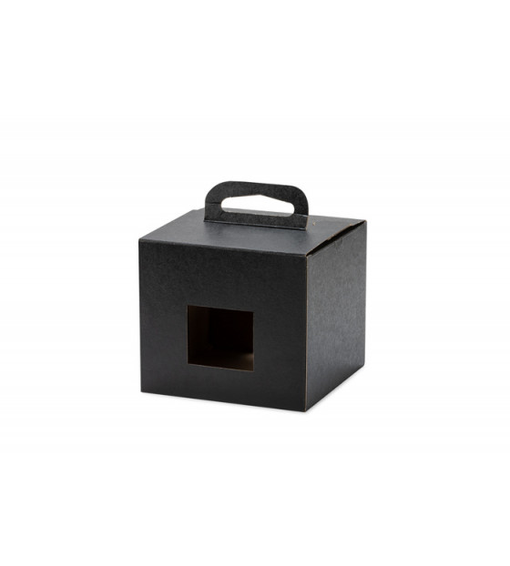 Black cardboard box (kraft interior) with two side openings and a fold-down handle for carrying up to 4 stackable plates: