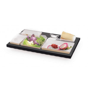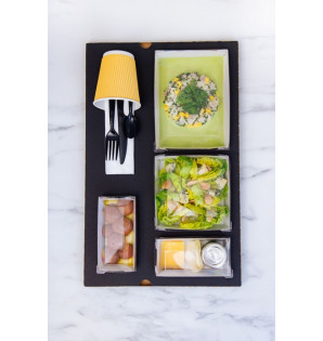 Black cardboard meal tray base, delivered assembled, with 5 slots suitable for our Cubik crockery. It is shown here with the Cubik Natural kraft/PET crockery kit with RPET lids: KITNA: 2 ramekins 130x65 mm + 1 plate 130x130 mm + 1 plate 180x130 mm. For transport, the base fits into the black Vision case with window PSK10N.