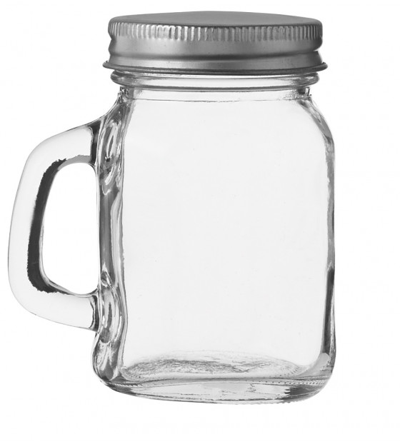 Mini 12 cl glass mug with grey metal screw cap. Ideal for serving or taking away, with a playful touch. Freezable and recyclable. Available in small packs of 20 u. MMP12