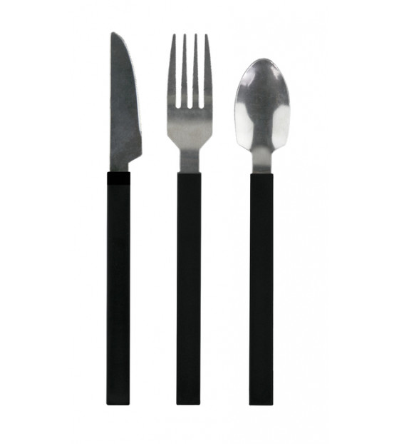 Stainless steel cutlery set with black PS handle, sober and contemporary. Goa cutlery offers a beautiful contrast of materials. They are durable, washable and reusable.