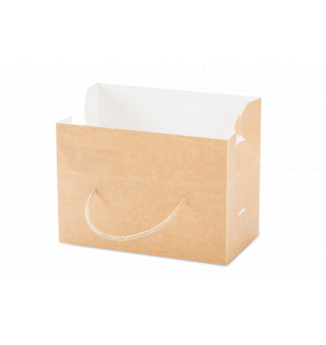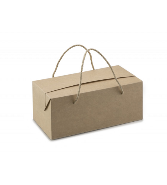 Kraft cardboard lunch box, with two natural cords as handles. Its top opening facilitates filling and gives a clear view of its contents. Delivered flat-packed, it is easy to assemble thanks to its automatic bottom. To finish, you have to insert the cords on both sides.