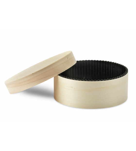 Round box made of French poplar wood from sustainably managed forests, made in France, with a black paper/PET box suitable for food contact and waterproof.