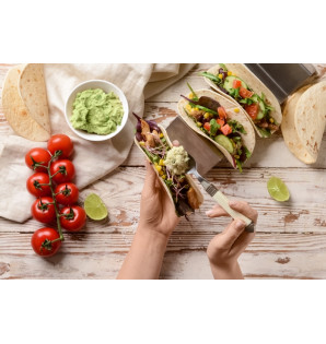 Simply place your corn or wheat tortillas in the holder's notches. The tacos stand vertically, ready to be filled. Add your favorite ingredients: ground meat, shredded chicken, guacamole, salsa, shredded cheese, sour cream... Serve directly in the holder for a neat presentation at the table.