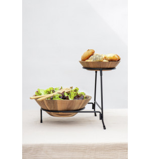 Black metal stand suitable for our 2 Acacia salad bowls SA230 and SA330: the smaller model fits at the top Ø170 mm and the larger at the bottom Ø230 mm. The display stand is stable thanks to its non-slip feet. It can be completely dismantled and is delivered flat (340x340xh70 mm).