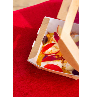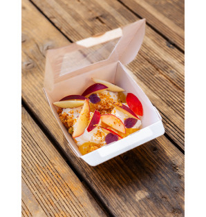 Square kraft cardboard container with PET window. Its 50cl capacity is ideal for a small dish or a dessert. The hinged lid makes it very practical for takeaway sales. It can be quickly placed in the oven (100°C) or reheated in the microwave (1 minute at 800°C). Recyclable.