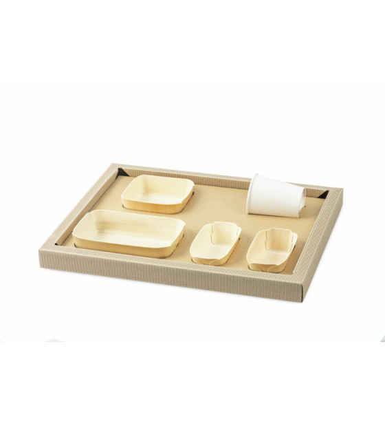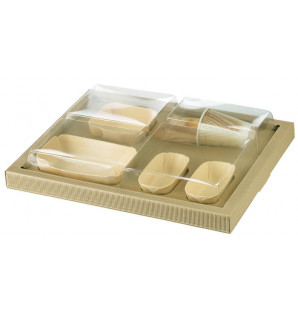 - 1 plate 175x110mm + 1 plate 115x115mm + 2 plates 120x70mm. The poplar wood and PET film tableware is watertight and suitable for oven and microwave cooking.