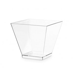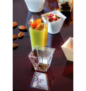 This 5 cl PS container is ideal for festive use as a chupito or shot, but is also perfect as a simple little verrine. Its unique design will add a touch of refinement to your cocktails. This model is also available in a completely transparent version CH50 .