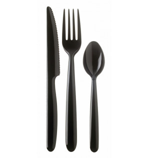 Luxor cutlery set in high-quality black PS, comprising a fork, knife, spoon, napkin, salt & pepper. With their contemporary, they are pleasant to use, washable and reusable. The Luxor range comes in 4 kits: - in gloss black, kits 4/1 and 6/1 KL41N and KL61N - in transparent, kits 4/1 and 6/1 KL41C and KL61C