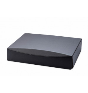 Prix €8.85 HTConditionnement : 1CCB39Embossed black premium cardboard box for displaying or delivering 4 Atlas 1/1 trays with their lids. This box will enhance your buffets or breakfasts. Pre-cut side handles ensure safe transportation. Delivered flat (69 x 47 cm), easy to assemble, with support rails to be inserted into the interior grooves. -