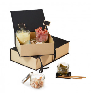 Prix €220.00 HTConditionnement : 100YFO41 box Essentiel black cardboard 250x185xh75 mm CEF1 1 table set with handles kraft cardboard 230x180 mm CEF 2 bowls Cubik 25 cl kraft/PET cardboard 110x110xh40 mm BCN25 1 ravier Cubik kraft/PET cardboard 130x65xh30 mm AKN6 -