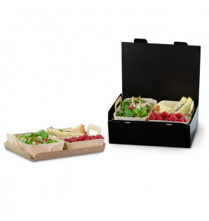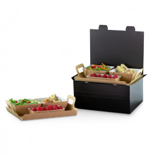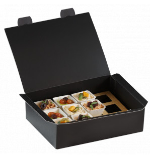 Prix €107.50 HTConditionnement : 100STH3Cardboard base for the Thema meal tray, to be combined with a lid in different colours: apple green CTHVP , vanilla CTHVA , tangerine CTHM , kraft CTHK , fuchsia/black CTHF or white with window CTHF100 . The tray can be completed with one of our Cubik crockery kits, with or without lid. 4 Thema bases are available: - Cocoa: delivered flat STH1 or assembled STH2 - Black: delivered flat STH3 or assembled STH5 - White: delivered flat STH6 or assembled STH7 - Kraft: delivered flat STHK or assembled STHK2 For serving, a slate grey non-slip placemat can be placed on the bottom of the tray NAD3227 . A kraft cardboard verrine holder (20 x 40 cells) holds 20 Kova 6cl verrines CAL20C . -