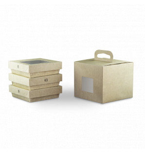 Prix €242.70 HTConditionnement : 100YFO31 Bento box in kraft cardboard 175x175xh150 mm CBK17 3 1-liter trays in kraft/cellophane cardboard 160x160xh50 mm BNK160 -