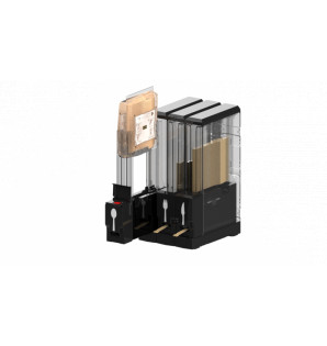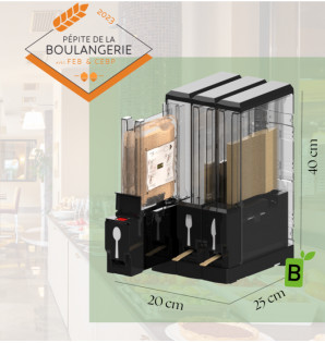 Prix €220.00 HTConditionnement : 1D3CBComatec presents WOODLERY, a unique dispenser of specially adapted and customisable wooden cutlery : knife CDW17 , fork FDW17 , large spoon GCDW17 Voted ‘Pépite de la Boulangerie 2023’ by Honoré le Mag, CEBP and FEB. -