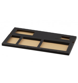 Black cardboard meal tray base, delivered assembled, with 5 slots suitable for our Cubik crockery. It is shown here with the Cubik Natural kraft/PET crockery kit with RPET lids: KITNA : 2 ramekins 130x65 mm + 1 plate 130x130 mm + 1 plate 180x130 mm. For transport, the base fits into the black Vision case with window PSK10N .