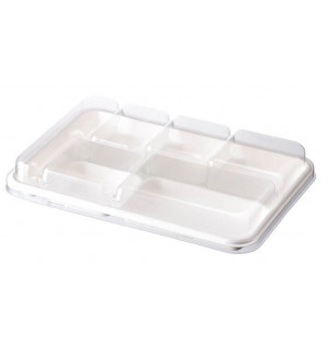 Compartmented lid made of transparent, recycled and recyclable rPET. Suitable for bagasse meal trays with 6 Snack 6 cells PF6C