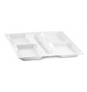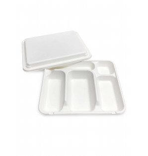Small bagasse meal tray with 5 compartments, including 1 for cutlery. It can be fitted with a matching lid CPF5F . The set can be placed in the freezer, oven or microwave. The Snack 5 tray a cost-effective solution for meal delivery (to mass catering, school and company canteens, hospitals...).